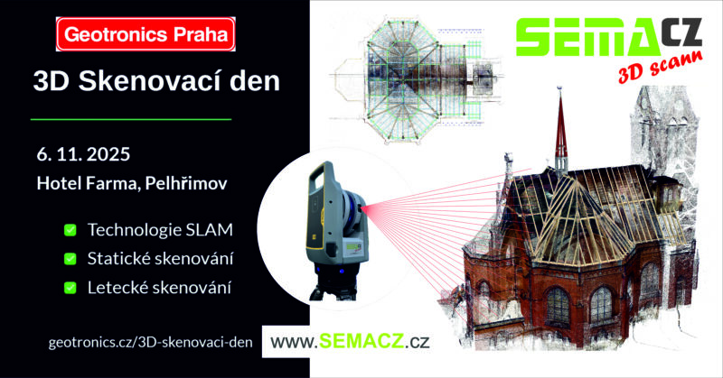 3D skenovací den 6.11.2025 – prezentace novinek v oblasti 3D skenování s praktickou ukázkou využití skenovaných dat. Akce pořádaná firmou GEOTRONICS, kde SEMACZ představí praktické ukázky a možnosti využití těchto technologií ve spojení se SEMA Software . Kompletní proces od 3D zaměření až po výrobní CNC data… registrace zdarma na 3D Skenovací den | GEOTRONICS Praha